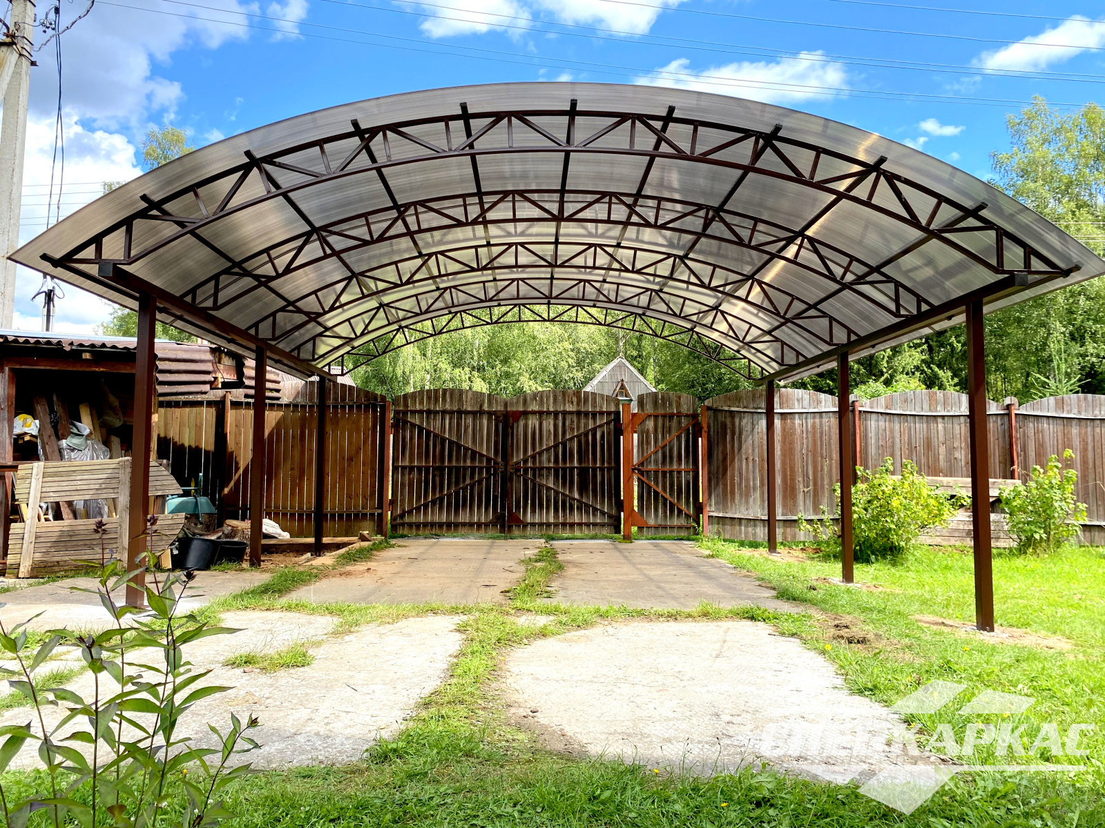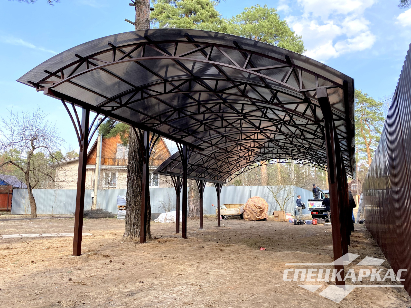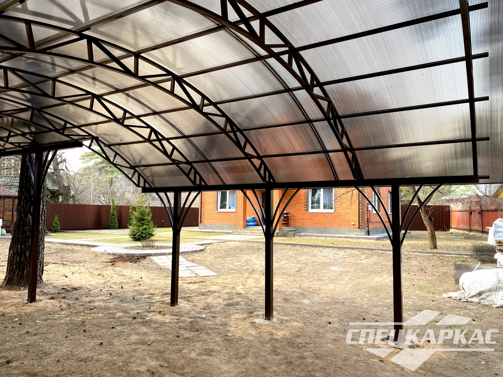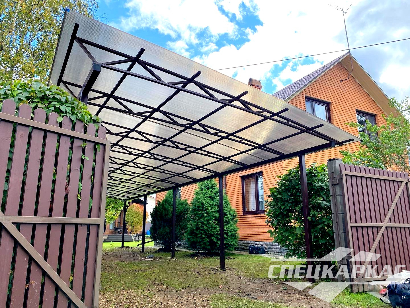 3D-проекты с картинками к моделям в каталоге дают точное представление о том, как устроены металлические навесы от СПЕЦКАРКАС. Но мы понимаем, что этой информации мало для того, чтобы составить полное представление о наших сооружениях. Поэтому мы сопровождаем коллекцию навесов из поликарбоната фото уже готовых объектов, которые мы сдали клиентам под ключ в Заокском или Тульской области.