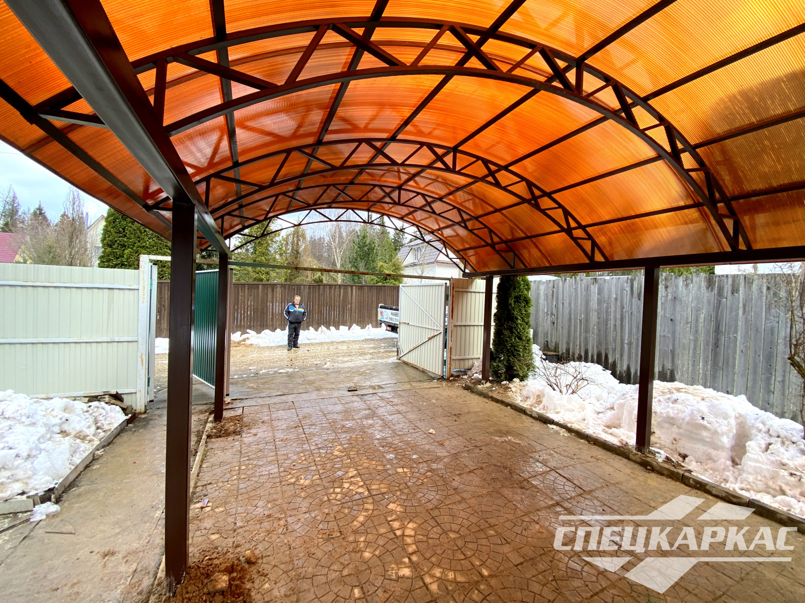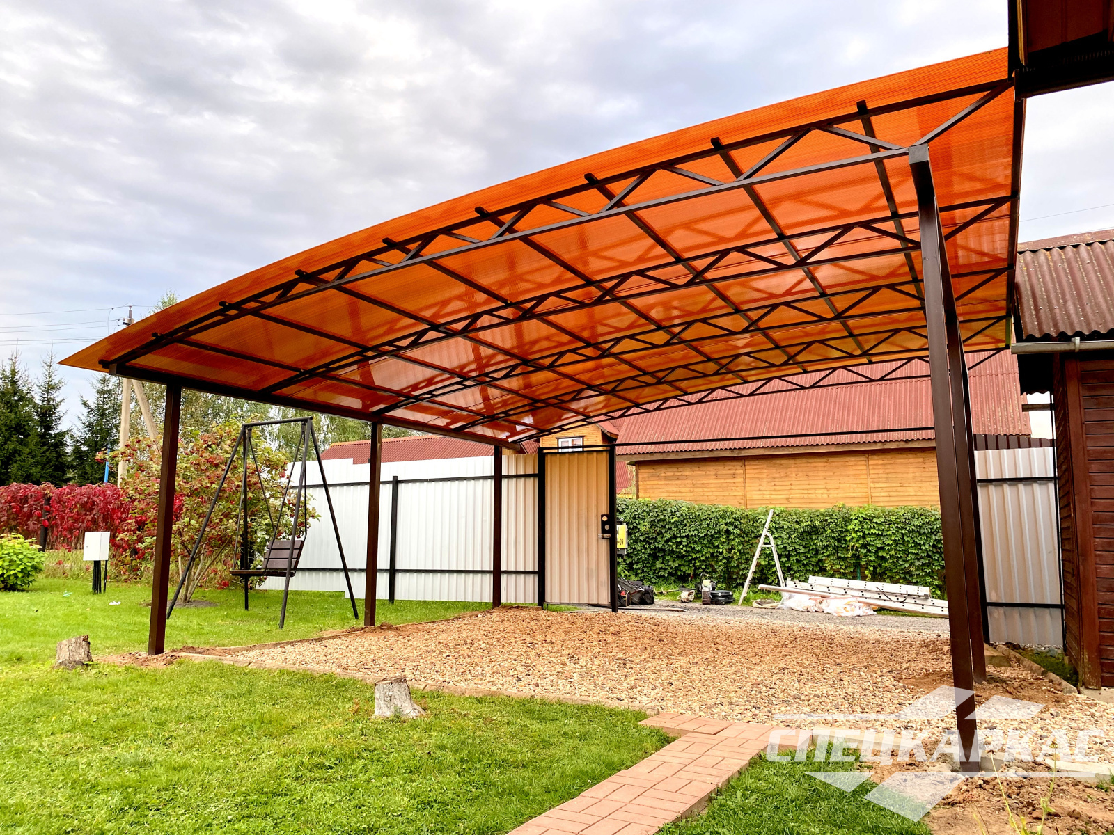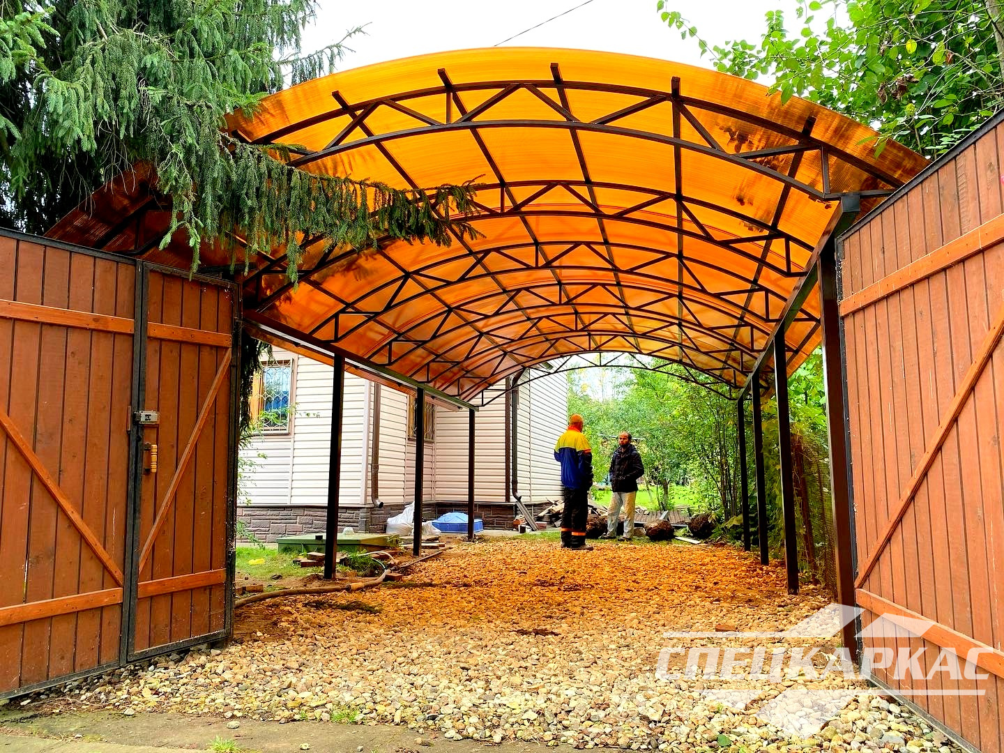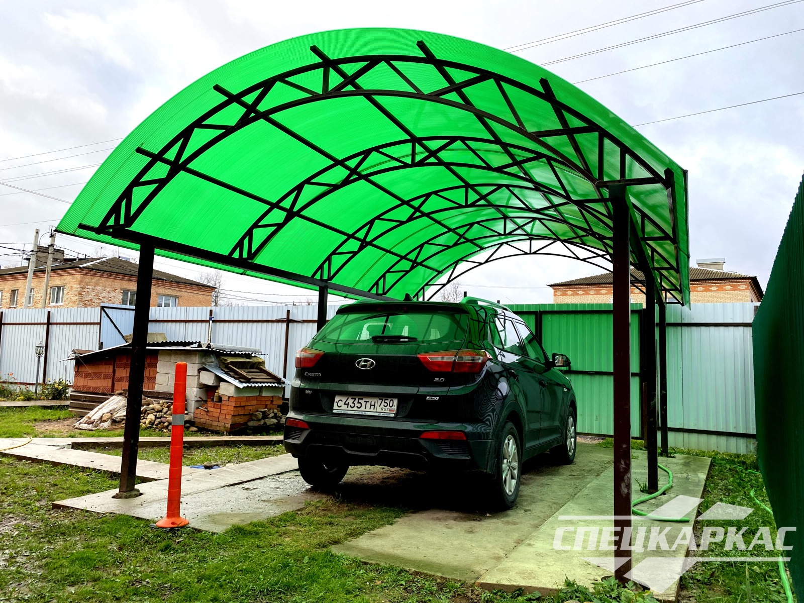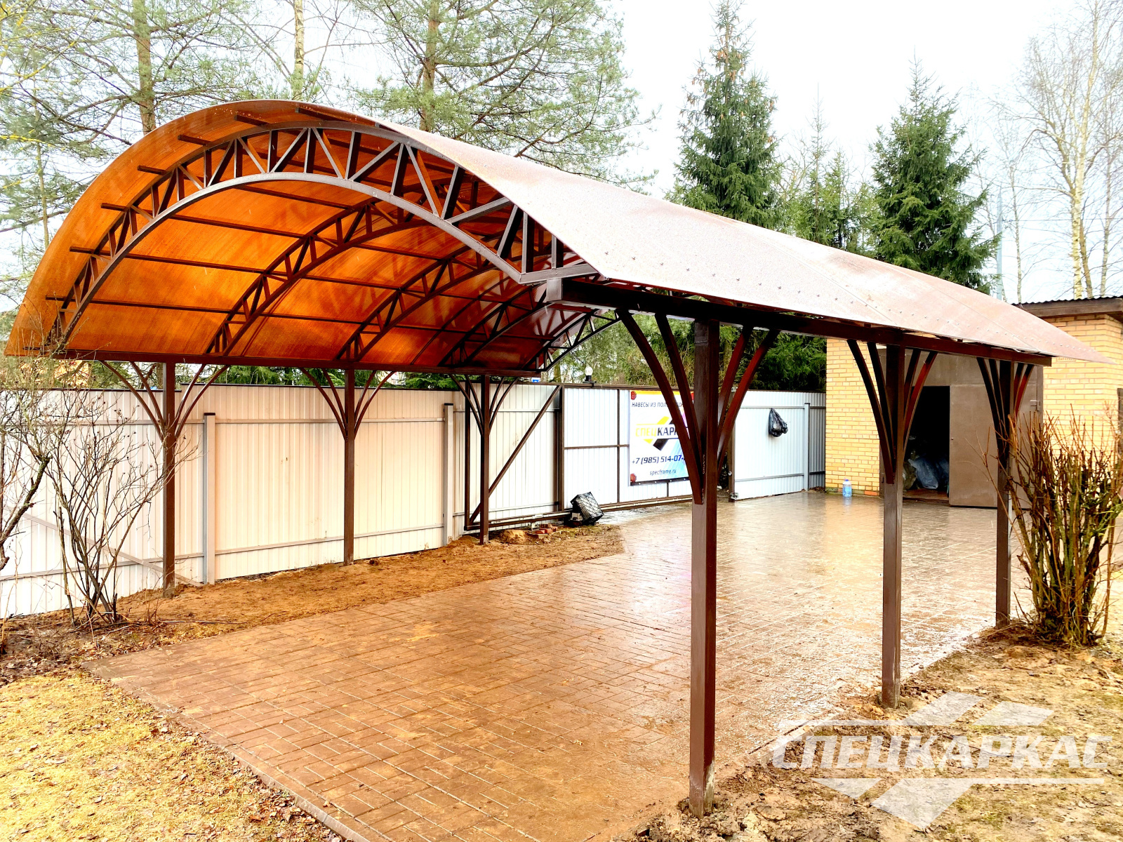 3D-проекты с картинками к моделям в каталоге дают точное представление о том, как устроены металлические навесы от СПЕЦКАРКАС. Но мы понимаем, что этой информации мало для того, чтобы составить полное представление о наших сооружениях. Поэтому мы сопровождаем коллекцию навесов из поликарбоната фото уже готовых объектов, которые мы сдали клиентам под ключ в Заокском или Тульской области.