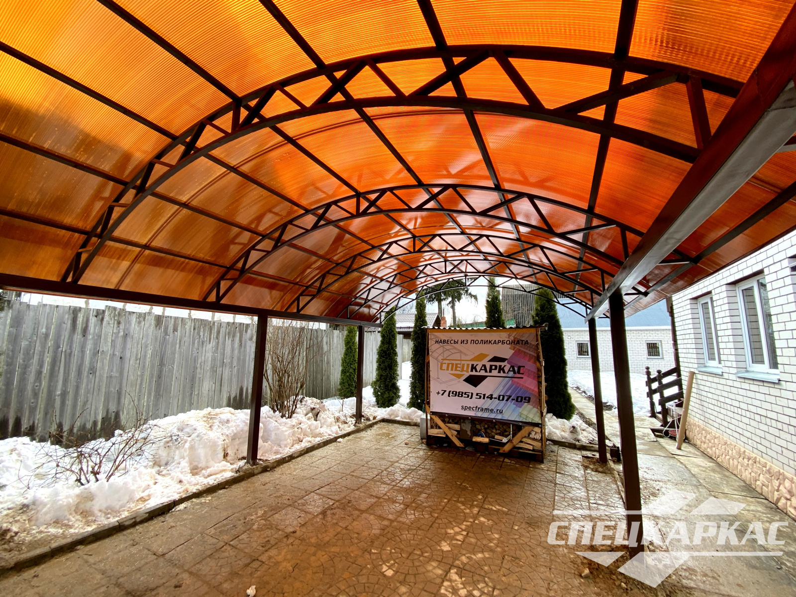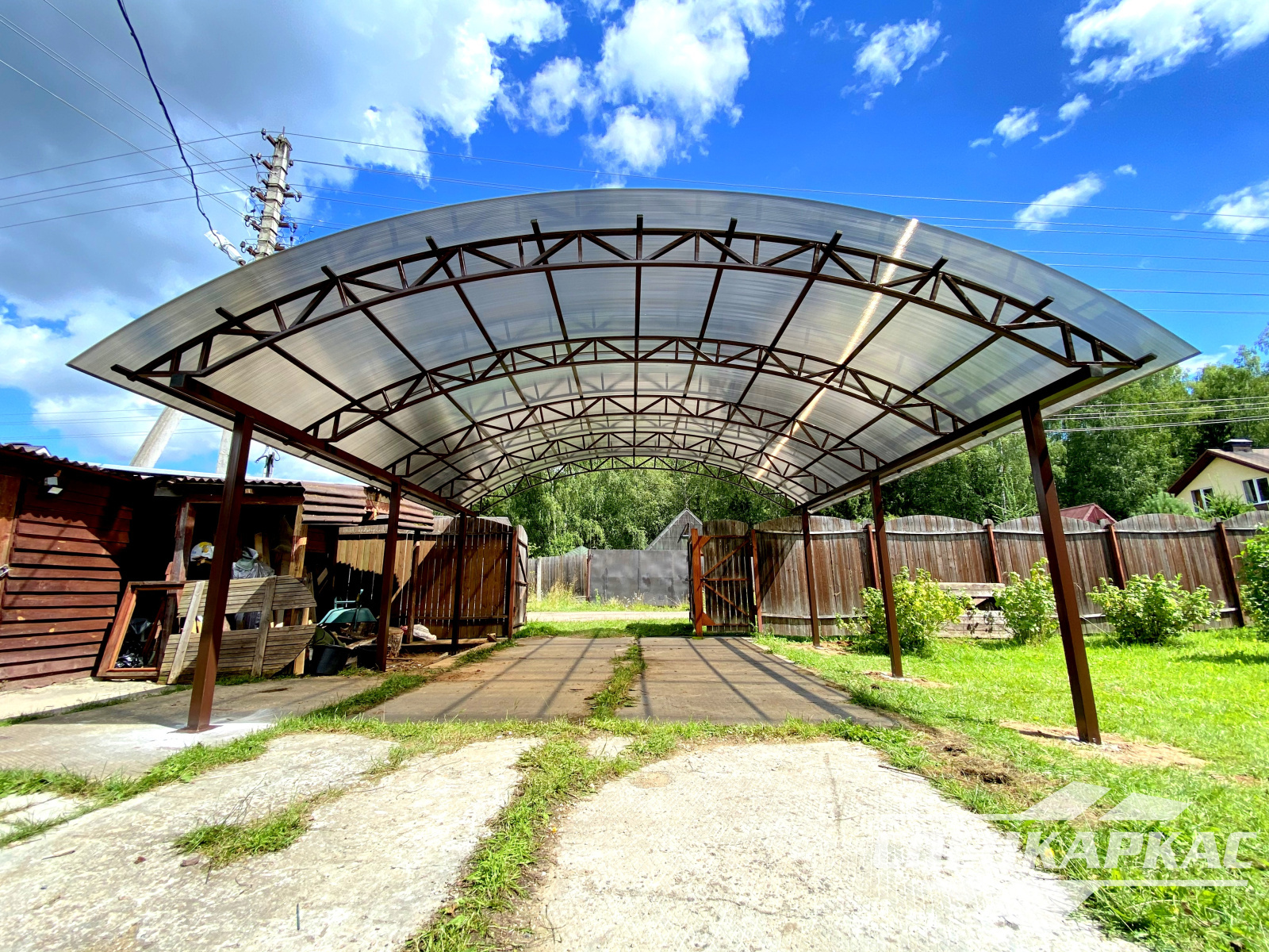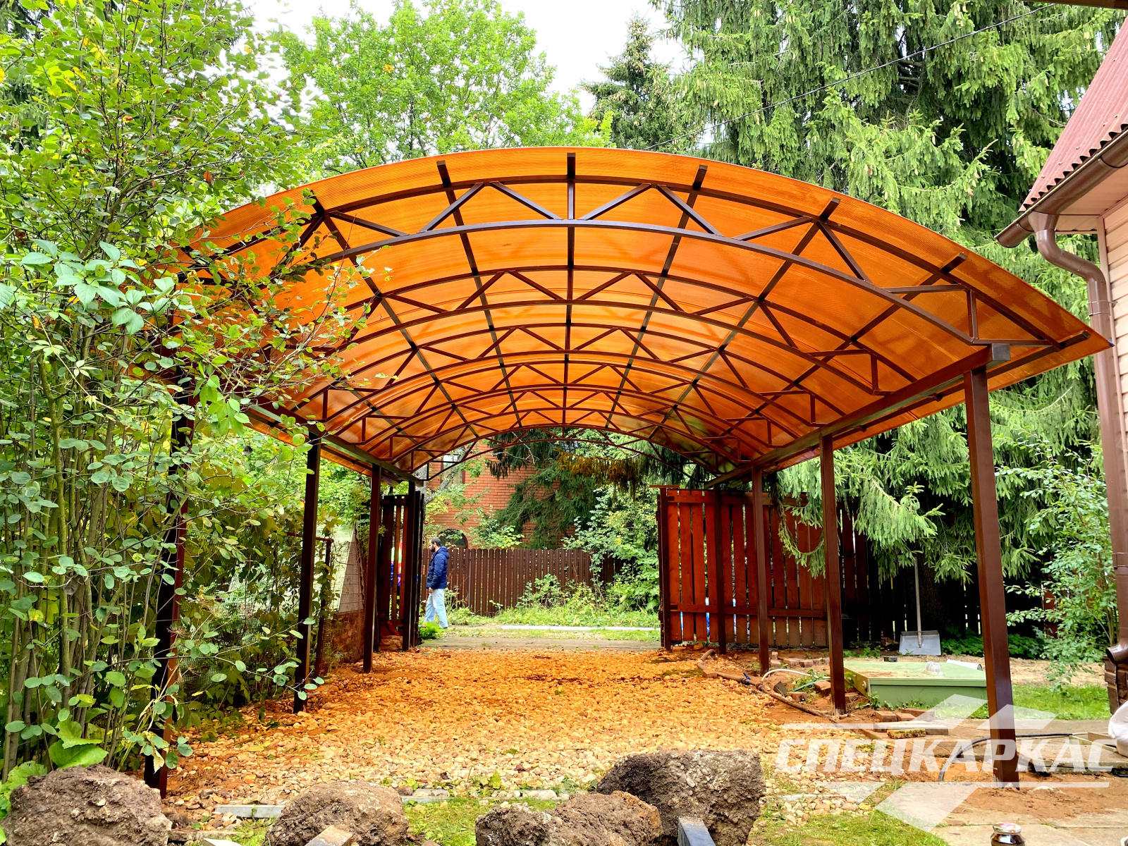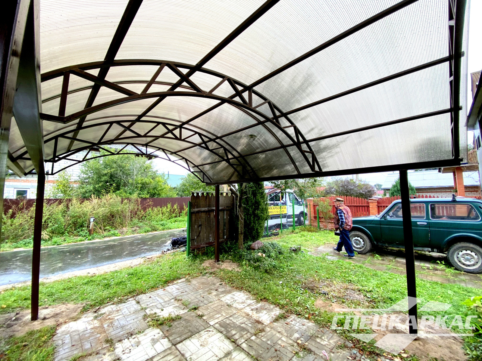 3D-проекты с картинками к моделям в каталоге дают точное представление о том, как устроены металлические навесы от СПЕЦКАРКАС. Но мы понимаем, что этой информации мало для того, чтобы составить полное представление о наших сооружениях. Поэтому мы сопровождаем коллекцию навесов из поликарбоната фото уже готовых объектов, которые мы сдали клиентам под ключ в Заокском или Тульской области.